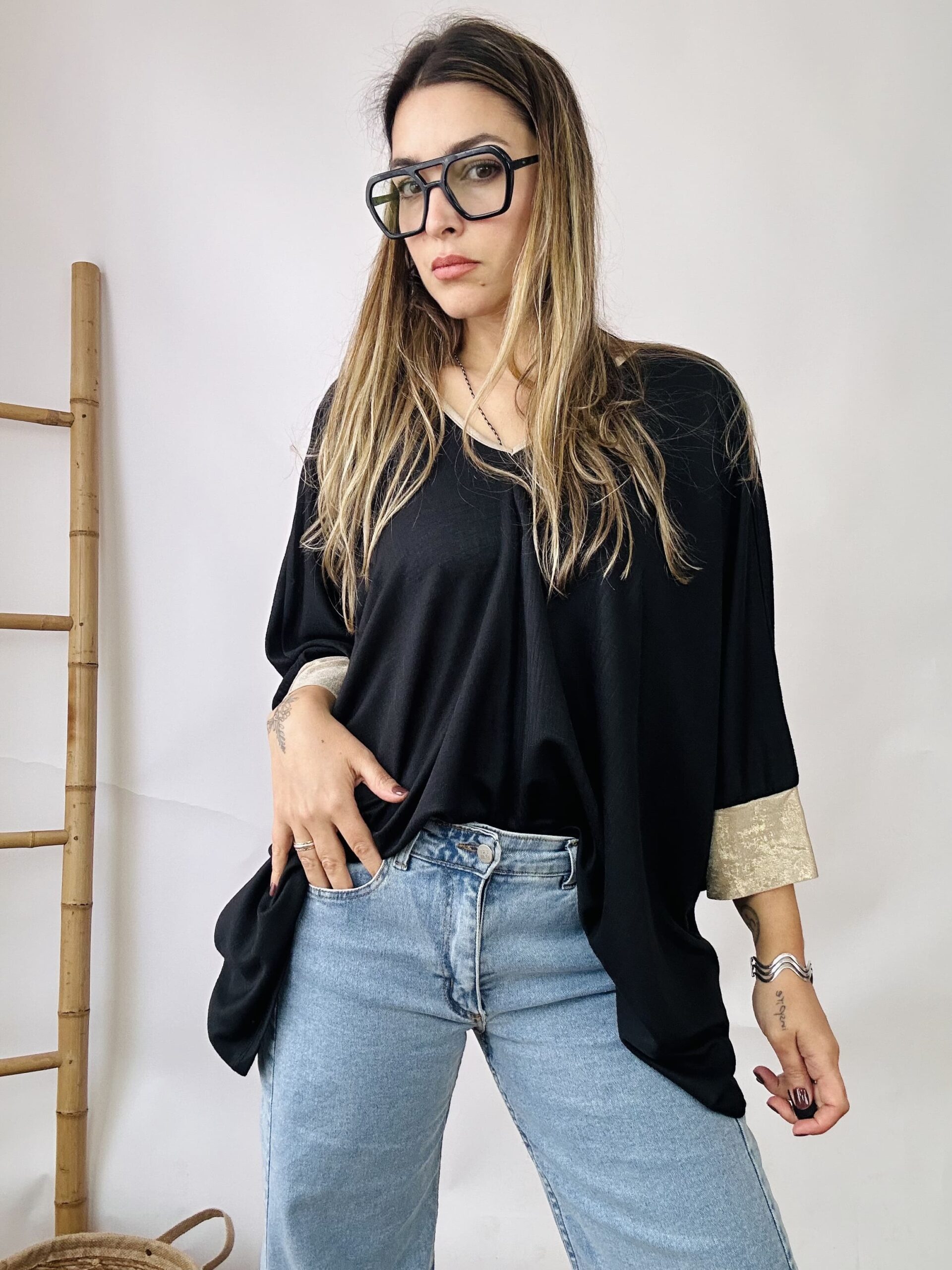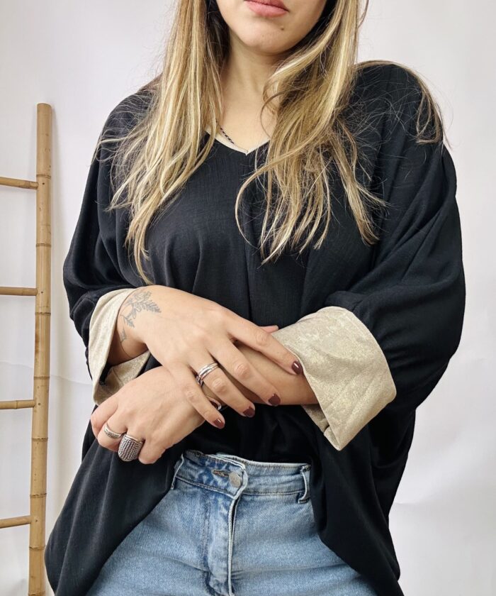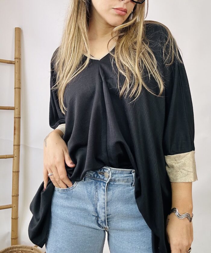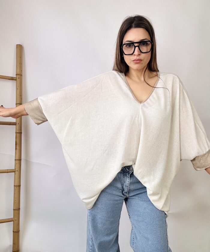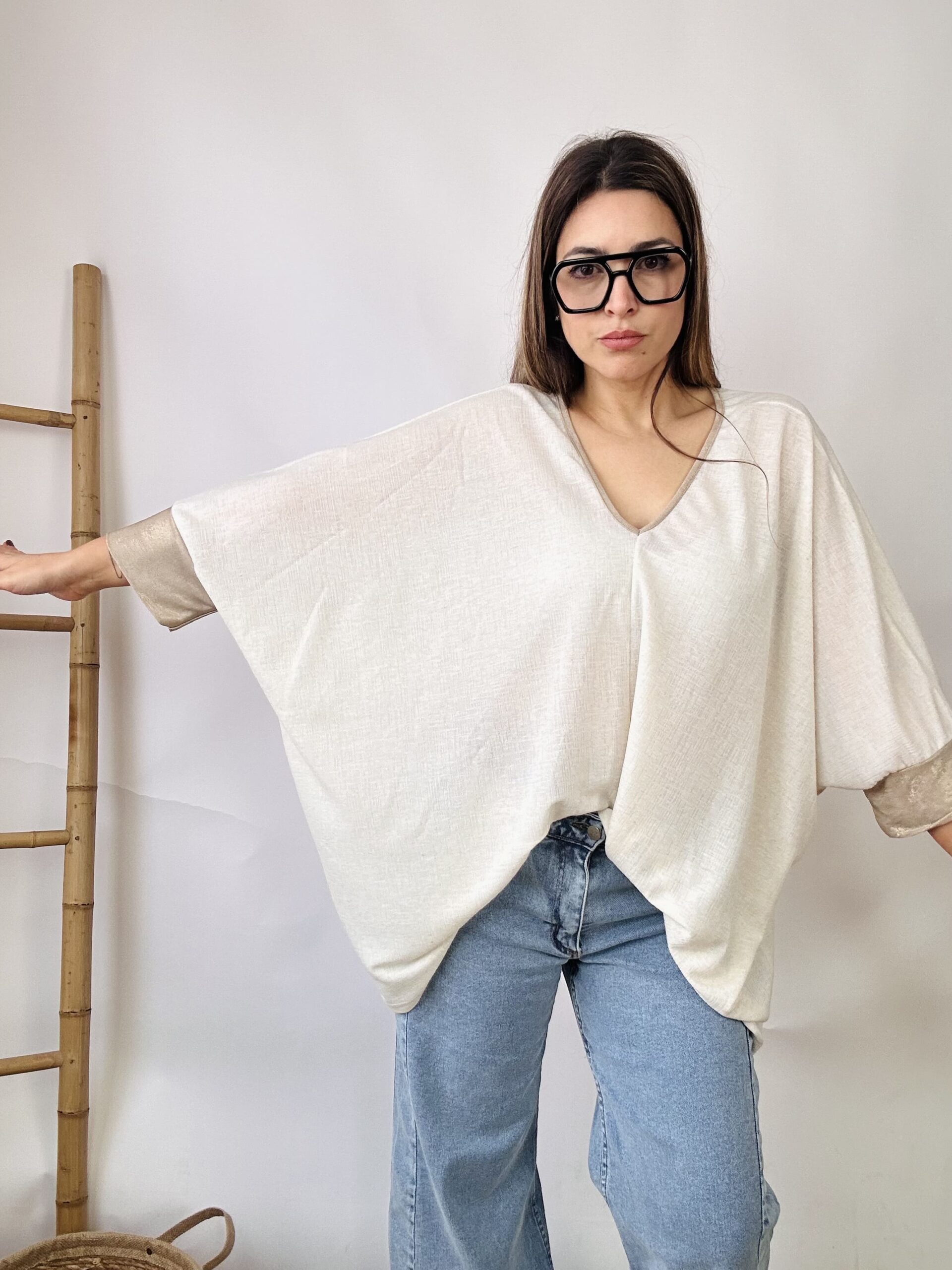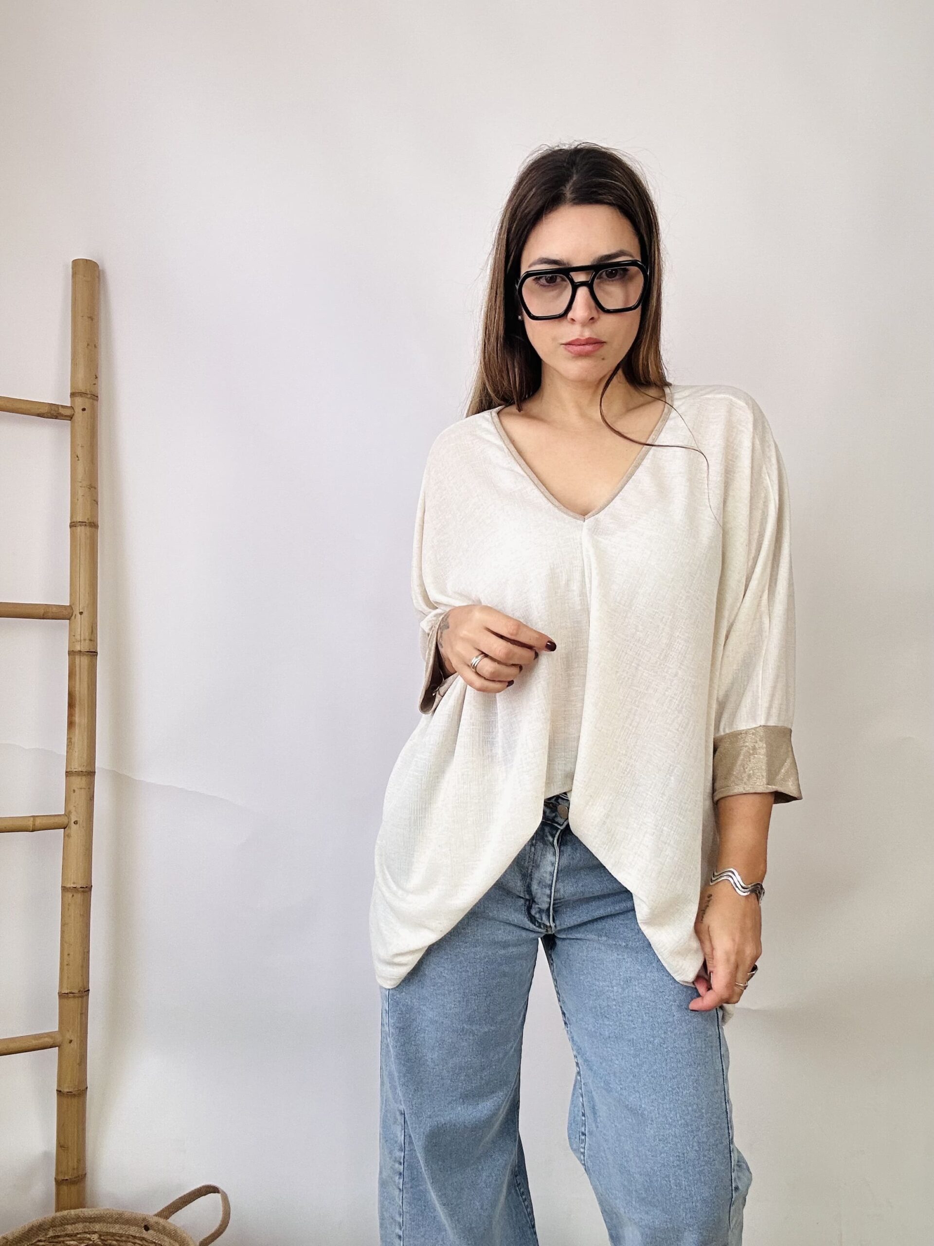 Blusa de corte amplio y fluido, diseñada para brindar comodidad y estilo. Confeccionada en crep con detalles de lurex en los puños, que aportan un toque sutil de brillo. Su escote en V y mangas 3/4 amplias la convierten en una prenda versátil y favorecedora. Ideal para realzar looks casuales con un aire sofisticado o para acompañar conjuntos más arreglados de noche. Disponible en talles plus-size y en varios tonos neutros que se adaptan a cualquier ocasión.