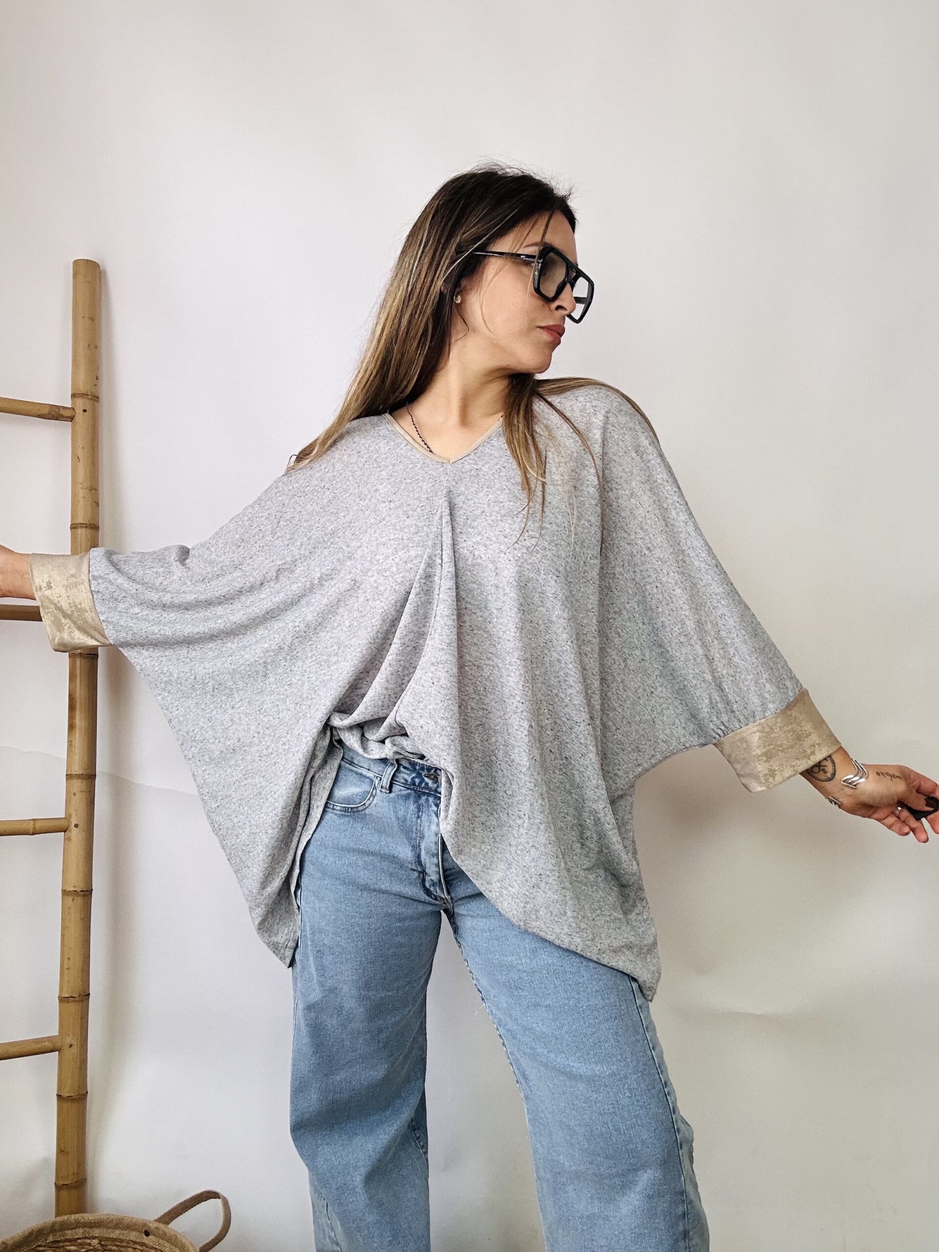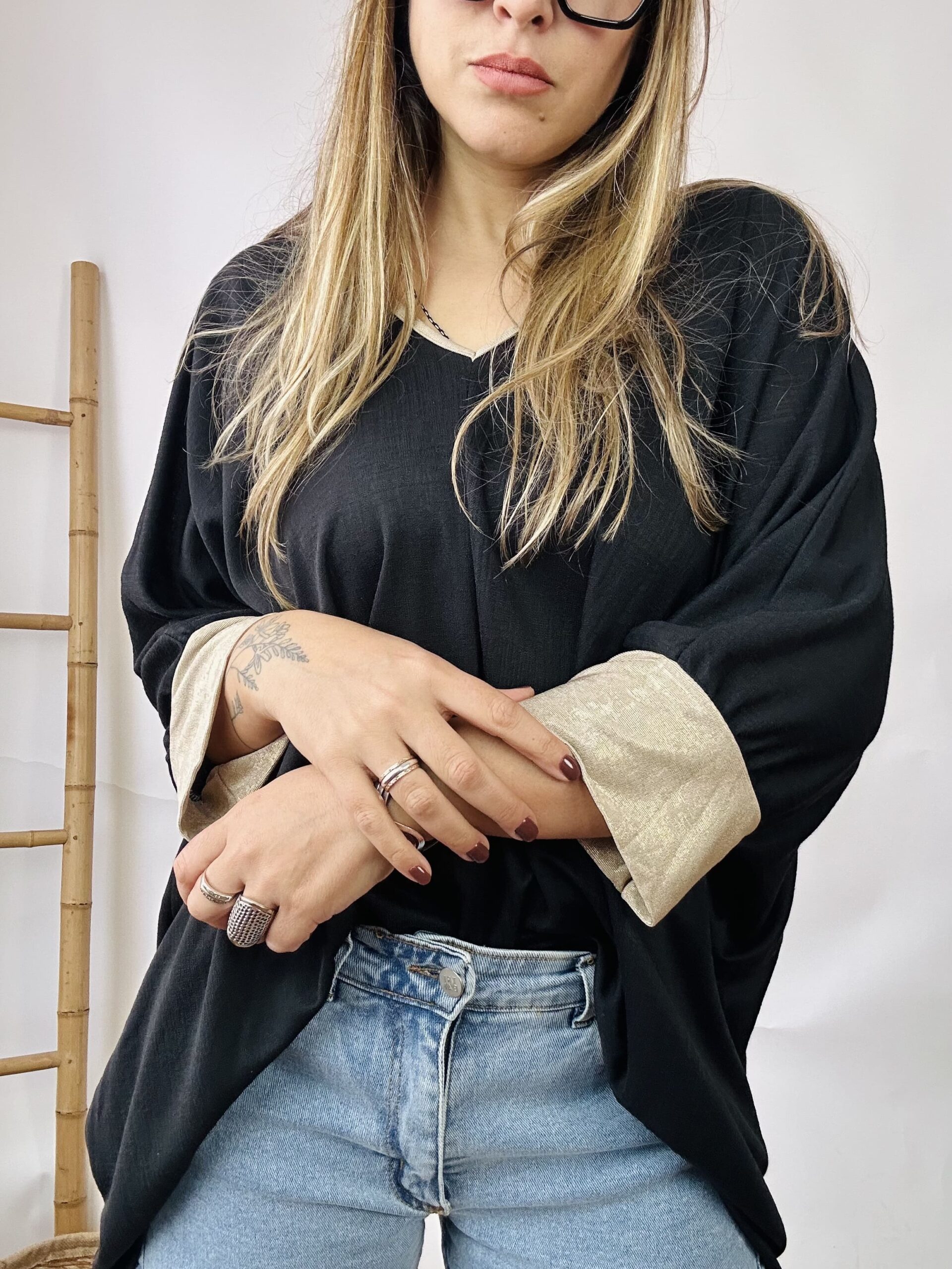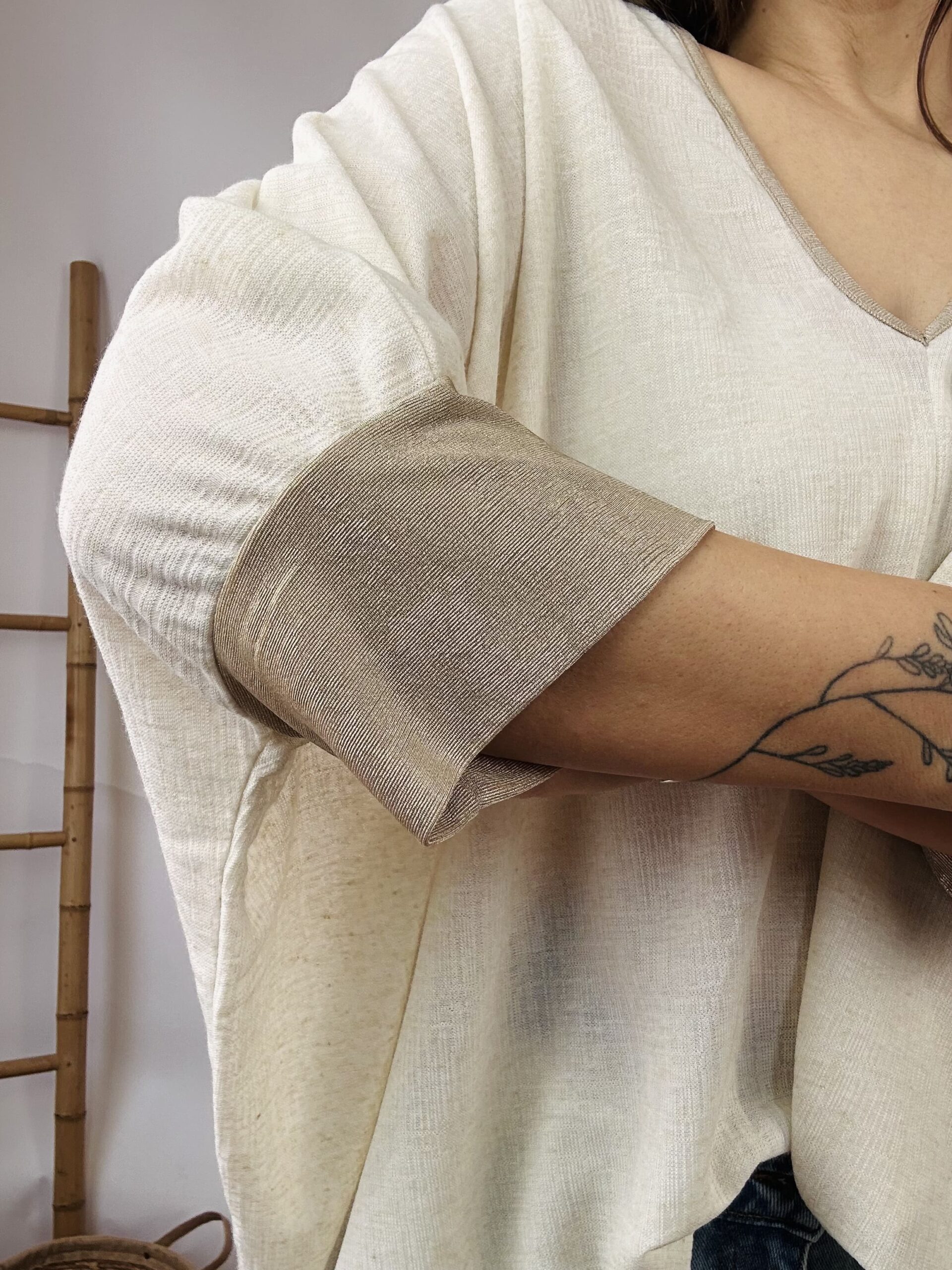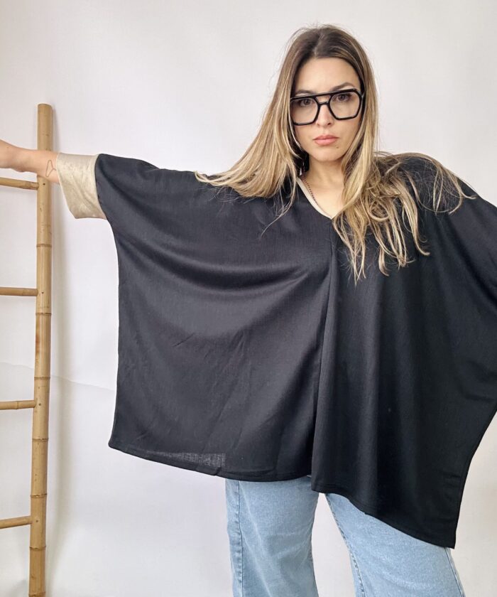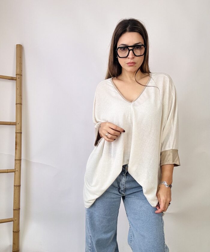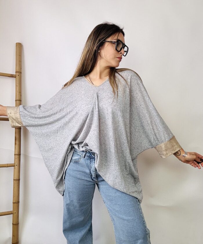 Blusa de corte amplio y fluido, diseñada para brindar comodidad y estilo. Confeccionada en crep con detalles de lurex en los puños, que aportan un toque sutil de brillo. Su escote en V y mangas 3/4 amplias la convierten en una prenda versátil y favorecedora. Ideal para realzar looks casuales con un aire sofisticado o para acompañar conjuntos más arreglados de noche. Disponible en talles plus-size y en varios tonos neutros que se adaptan a cualquier ocasión.