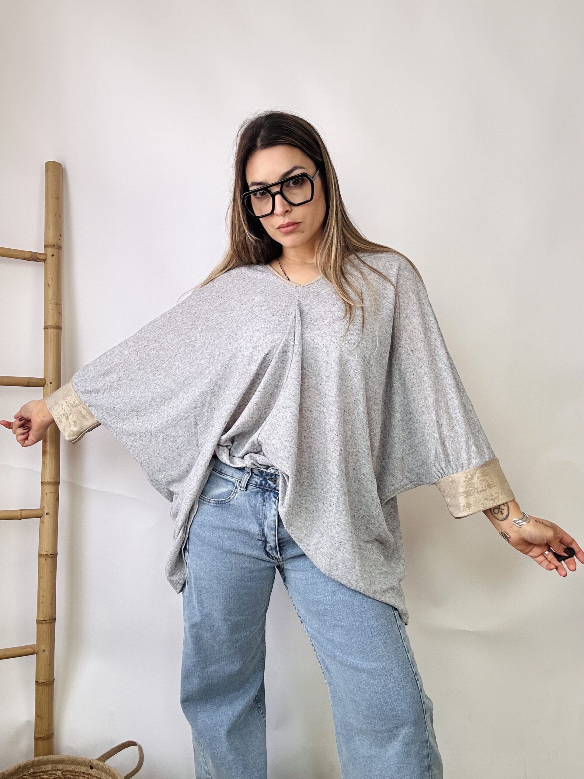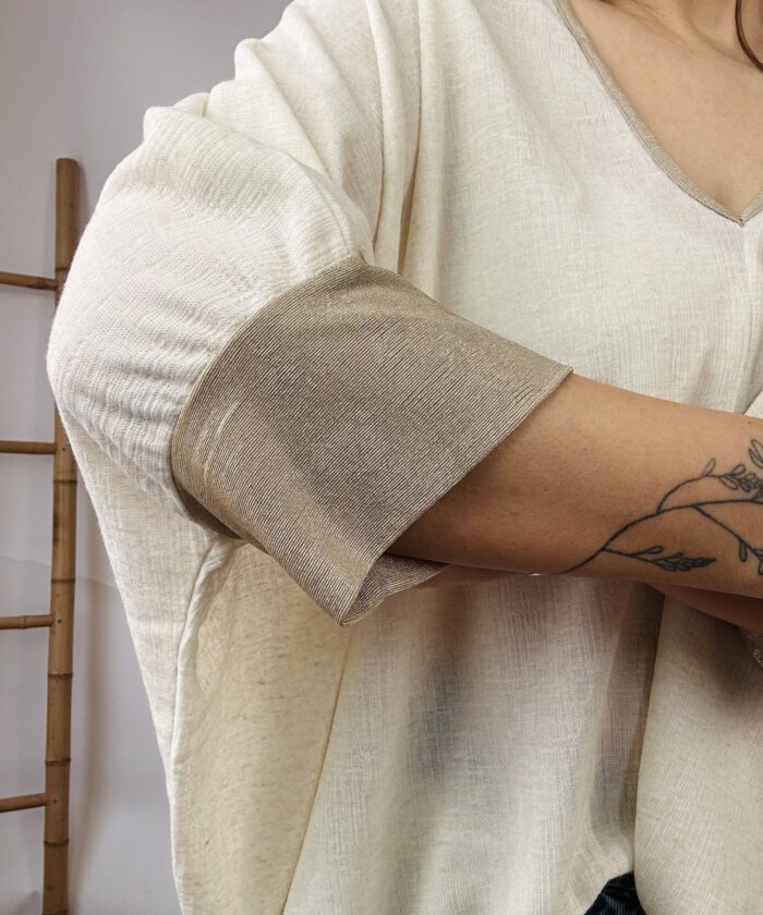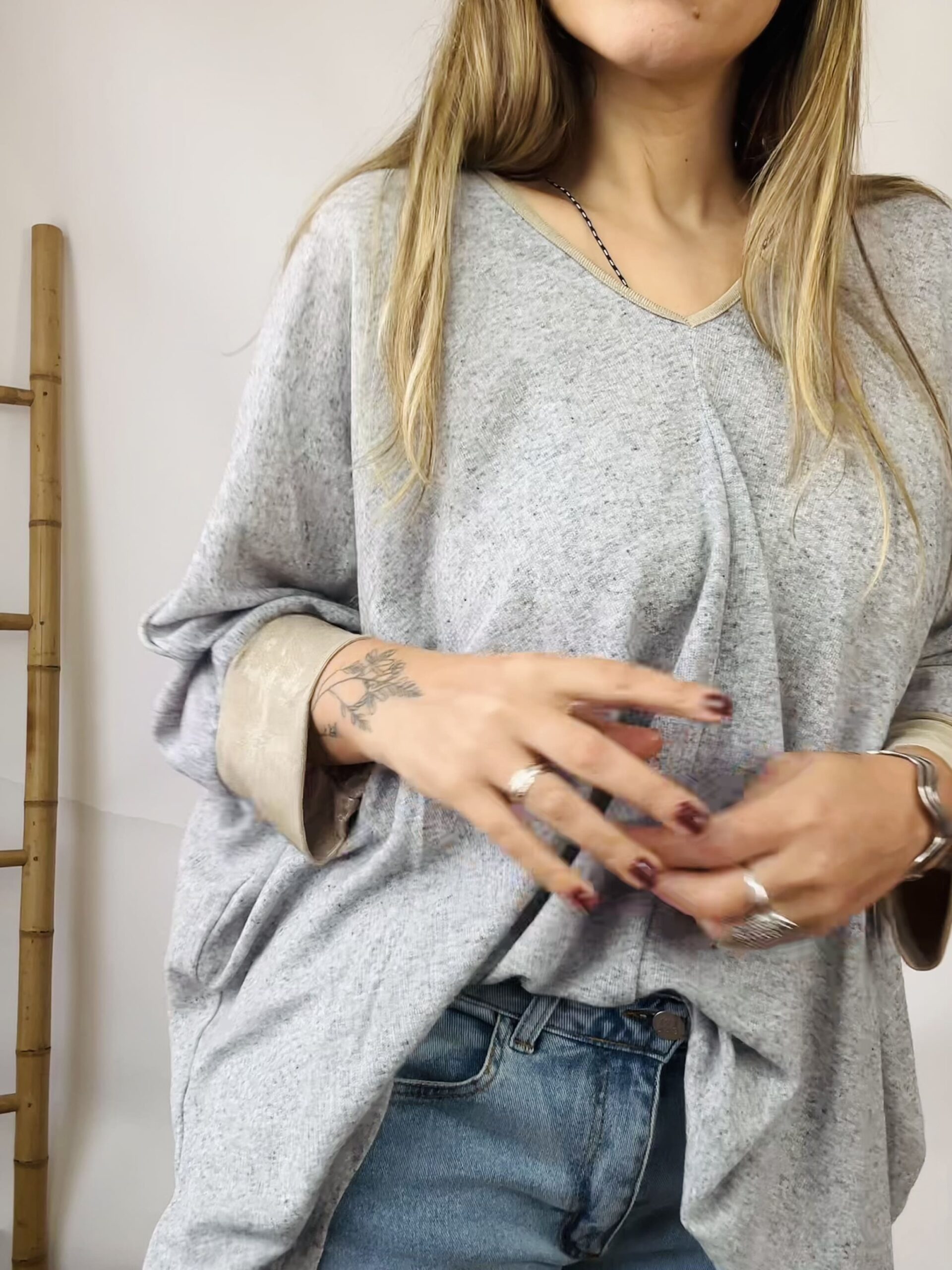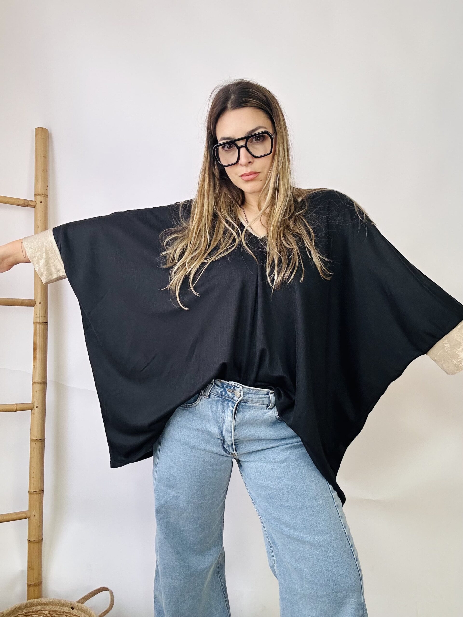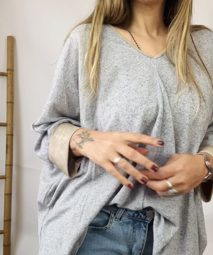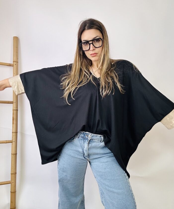 Blusa de corte amplio y fluido, diseñada para brindar comodidad y estilo. Confeccionada en crep con detalles de lurex en los puños, que aportan un toque sutil de brillo. Su escote en V y mangas 3/4 amplias la convierten en una prenda versátil y favorecedora. Ideal para realzar looks casuales con un aire sofisticado o para acompañar conjuntos más arreglados de noche. Disponible en talles plus-size y en varios tonos neutros que se adaptan a cualquier ocasión.