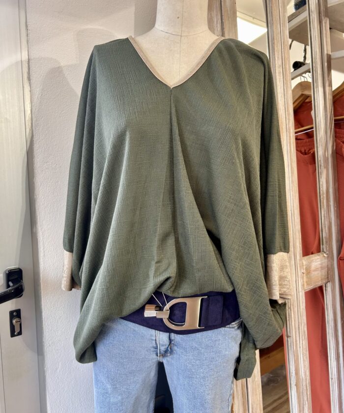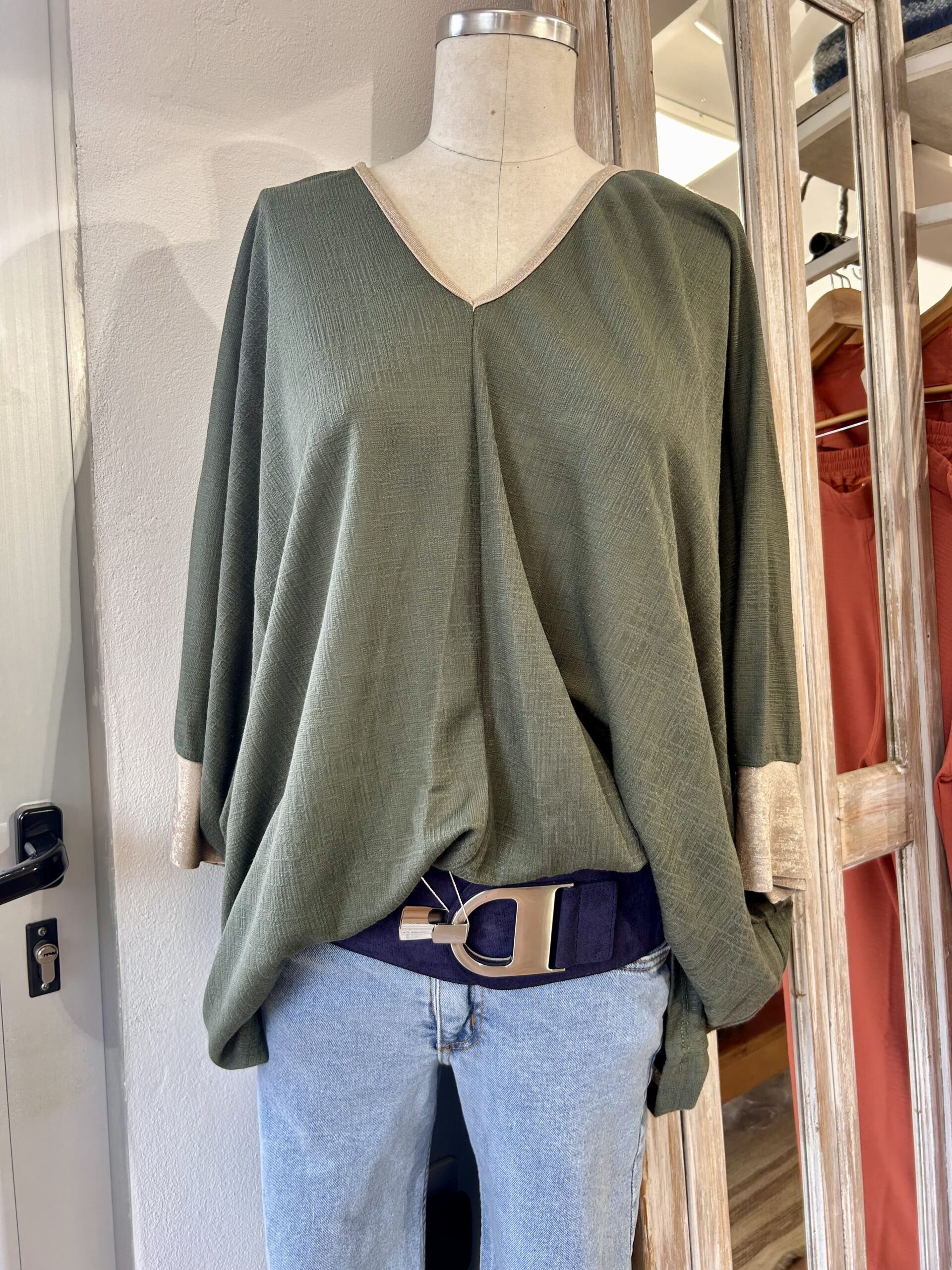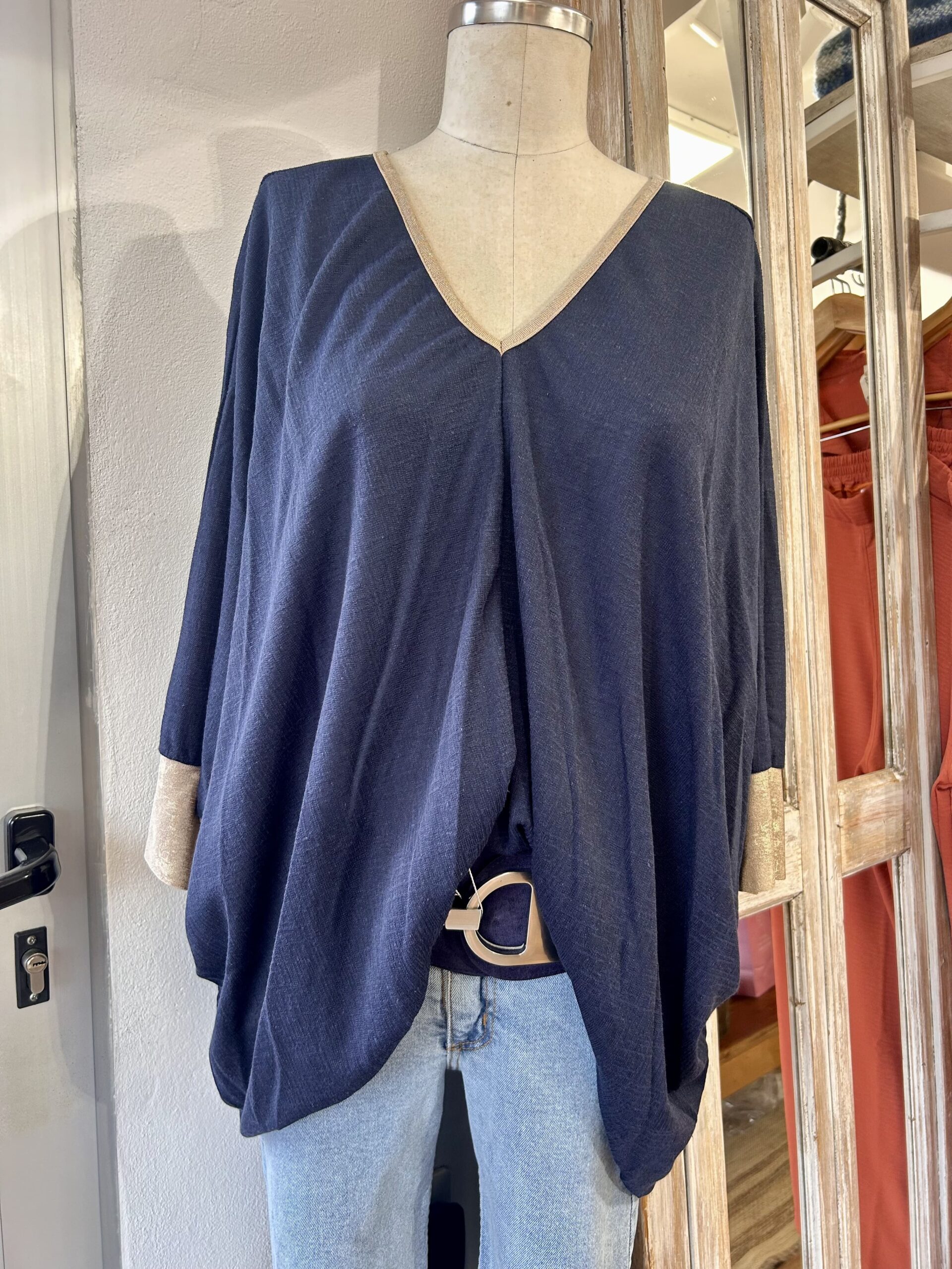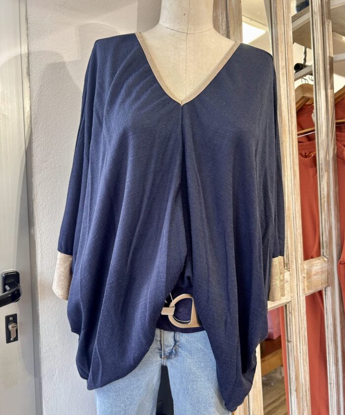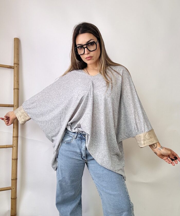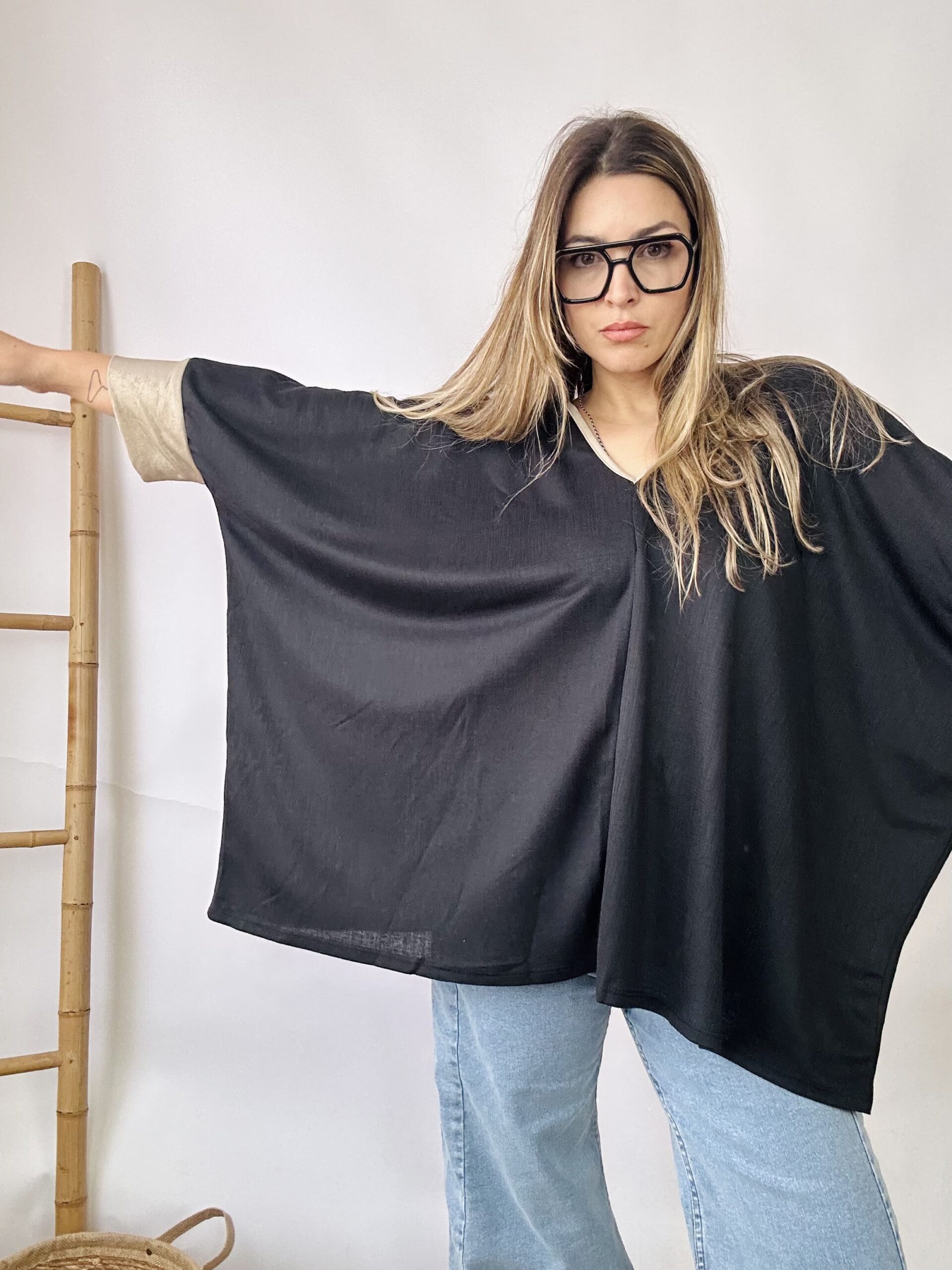 Blusa de corte amplio y fluido, diseñada para brindar comodidad y estilo. Confeccionada en crep con detalles de lurex en los puños, que aportan un toque sutil de brillo. Su escote en V y mangas 3/4 amplias la convierten en una prenda versátil y favorecedora. Ideal para realzar looks casuales con un aire sofisticado o para acompañar conjuntos más arreglados de noche. Disponible en talles plus-size y en varios tonos neutros que se adaptan a cualquier ocasión.