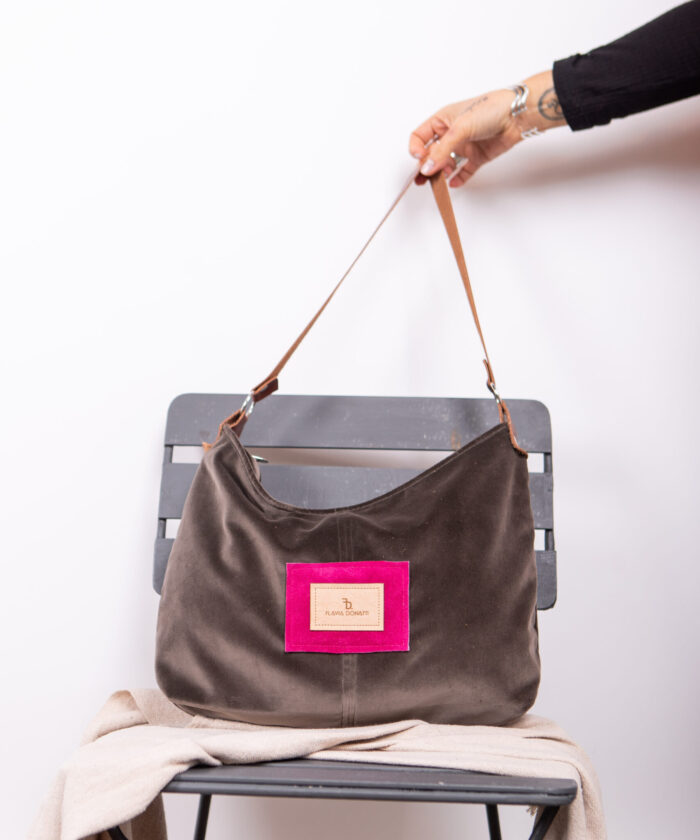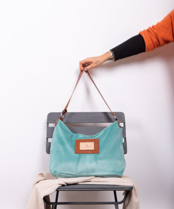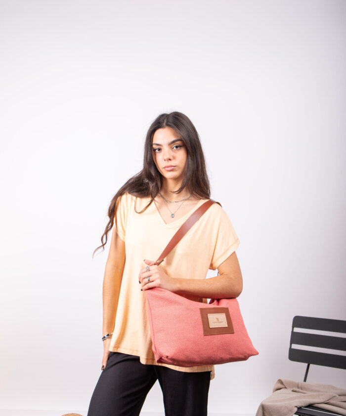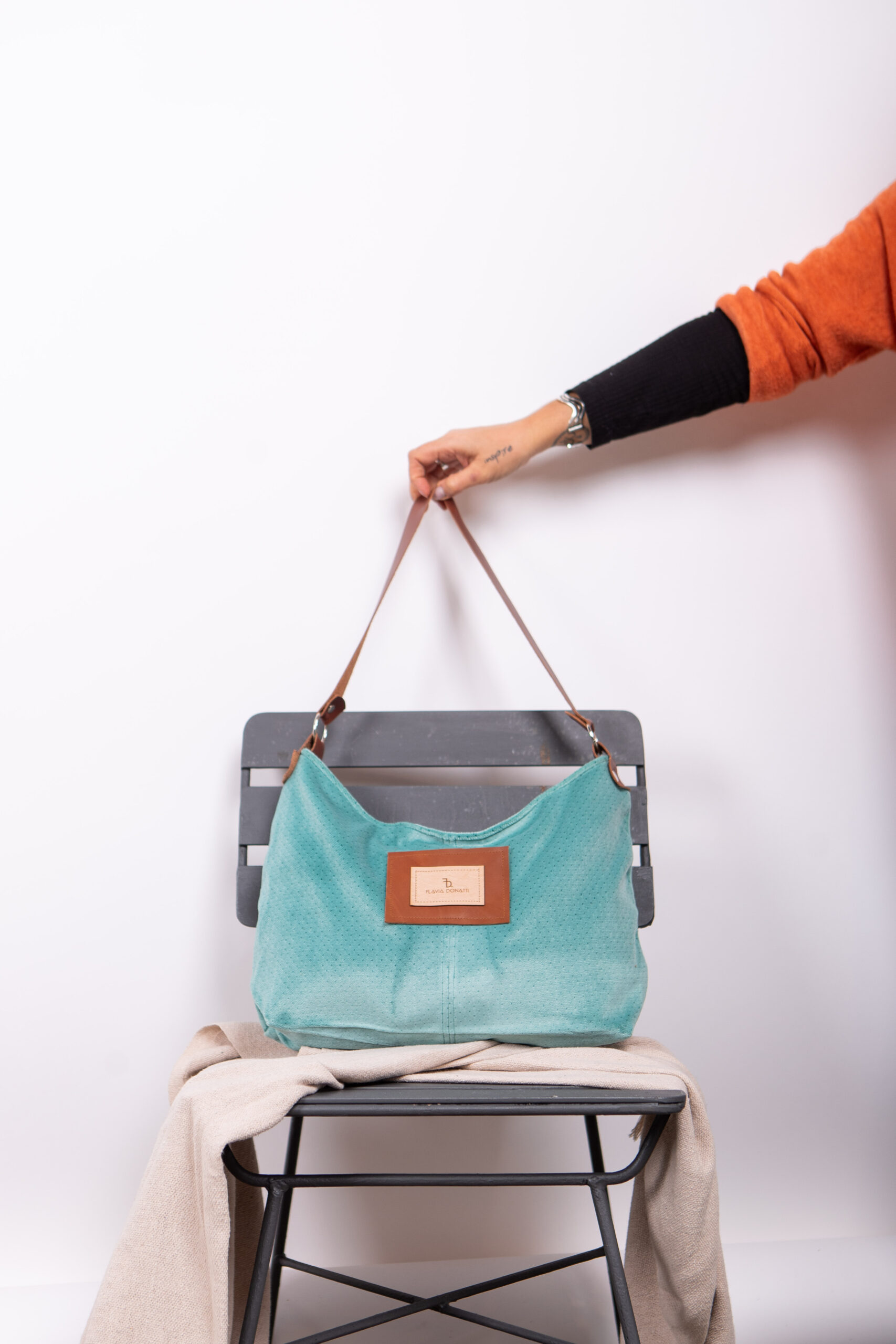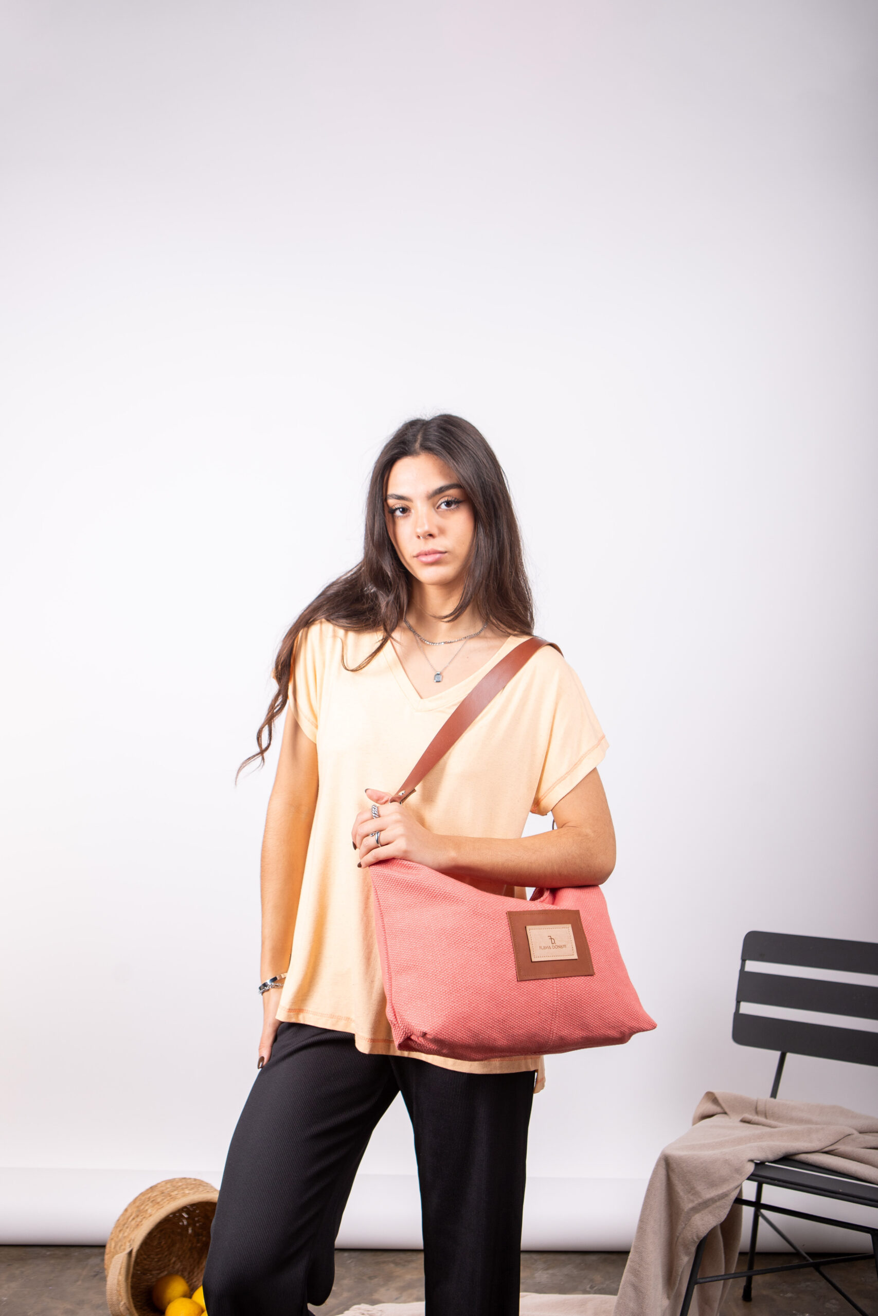 Cartera con asa en cuero y aros de metal. Totalmente forrada. Bolsillo interior y exterior. Telas divinas y resistentes. Detalle delantero en cuero. Muy cómodas.