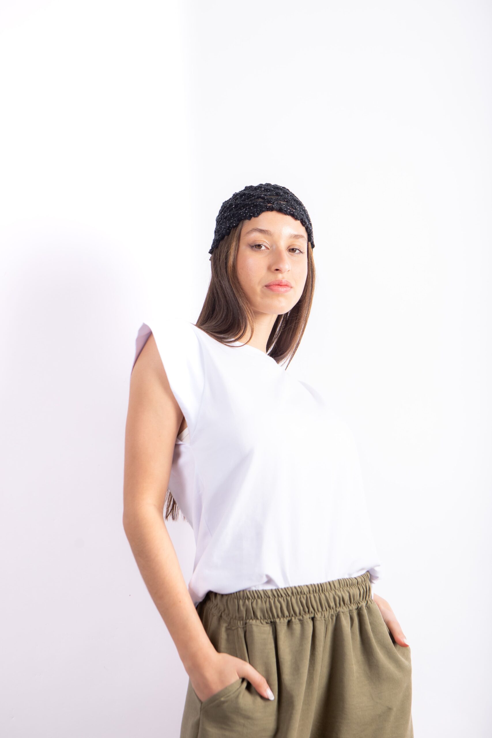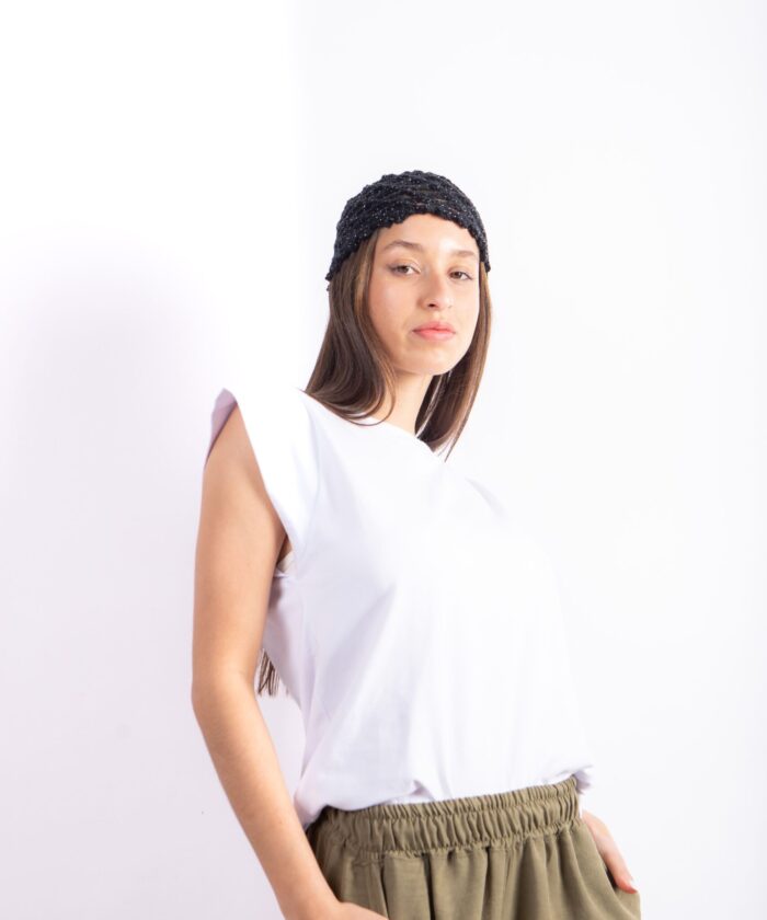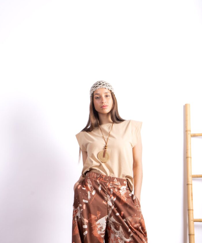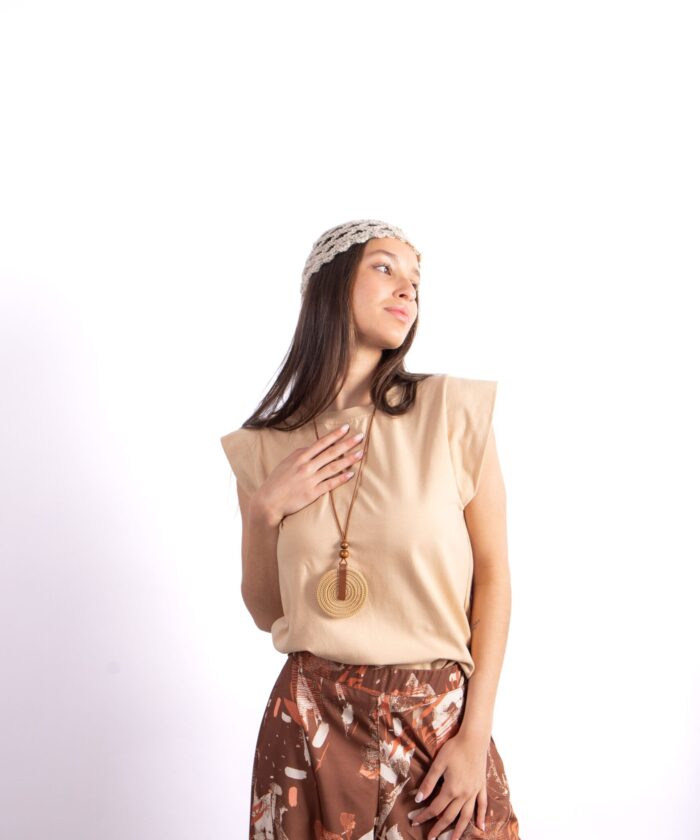 Remera confeccionada en algodón premium, de textura suave y liviana, con diseño de hombros marcados y caída relajada. Su silueta moderna realza la figura sin perder comodidad, ideal para combinar con pantalones amplios, faldas o jeans.