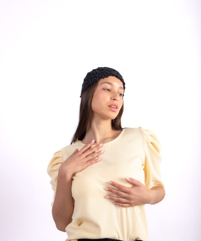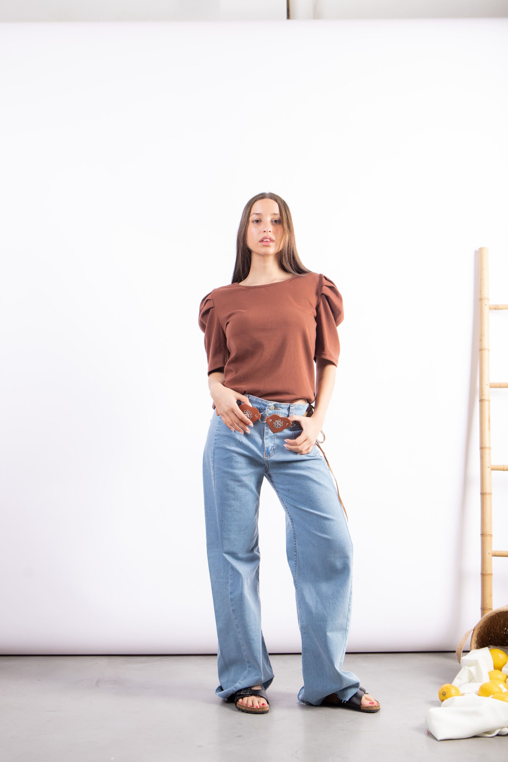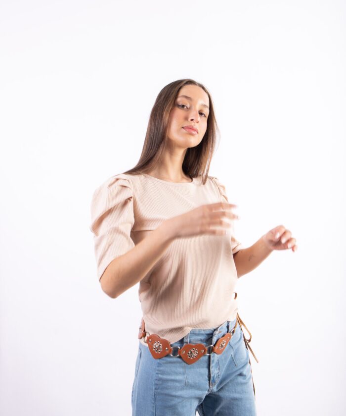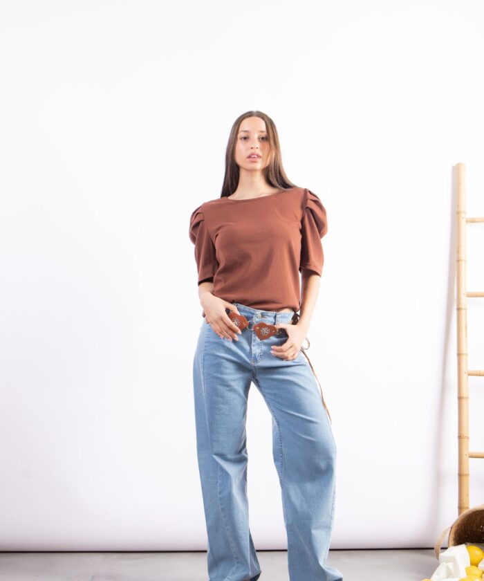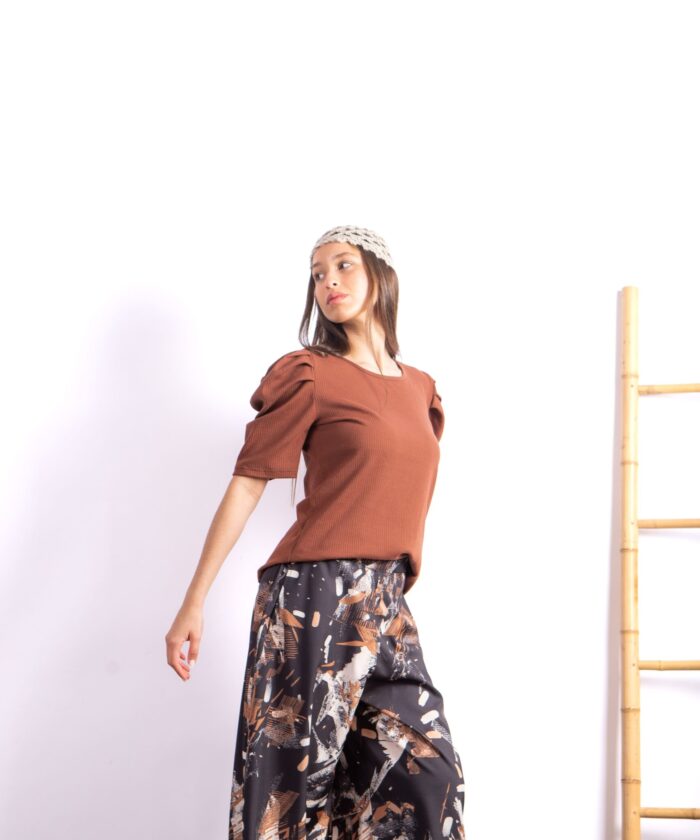 Presenta mangas con pliegues que aportan volumen y un aire femenino distintivo, elevando una prenda básica a un diseño con carácter propio.