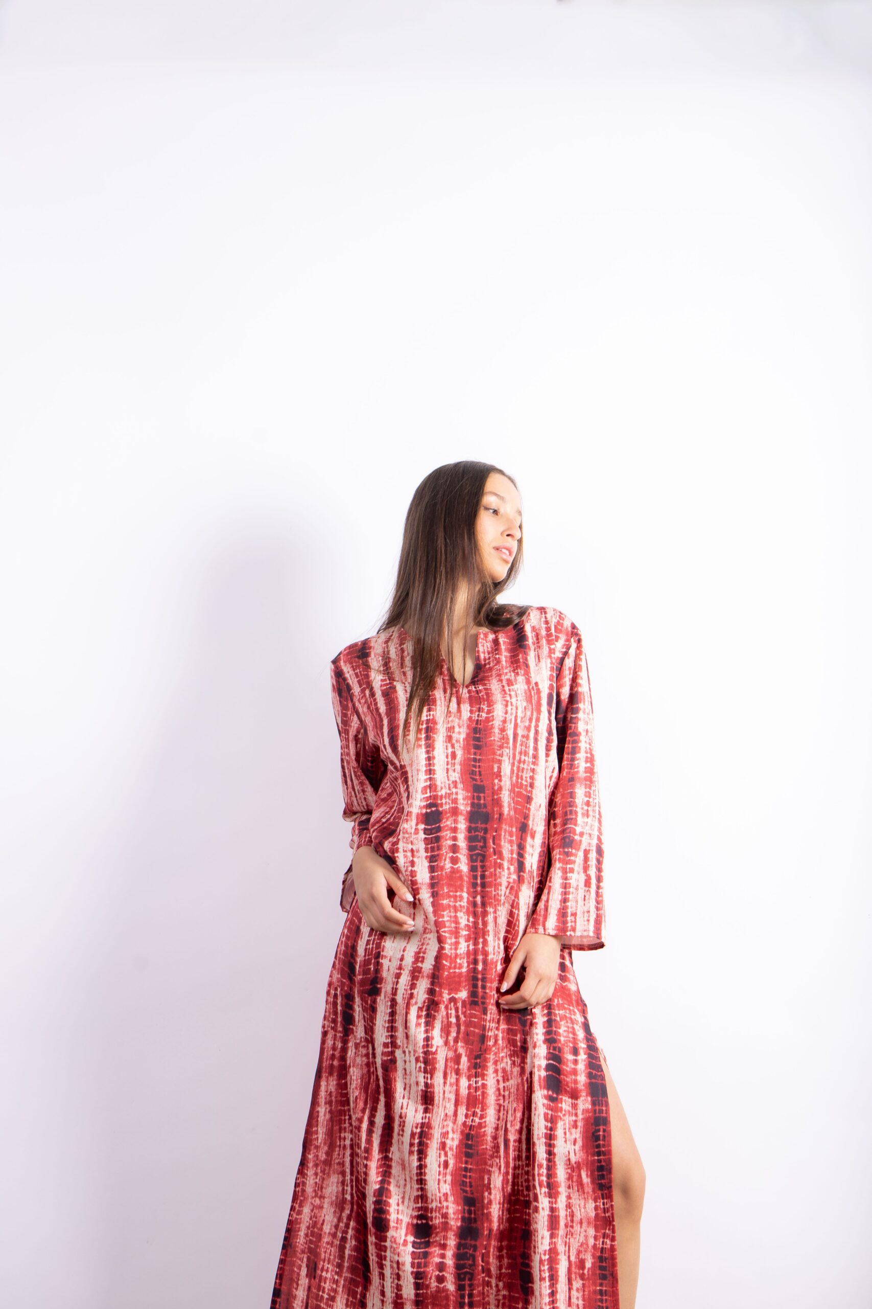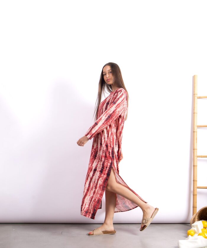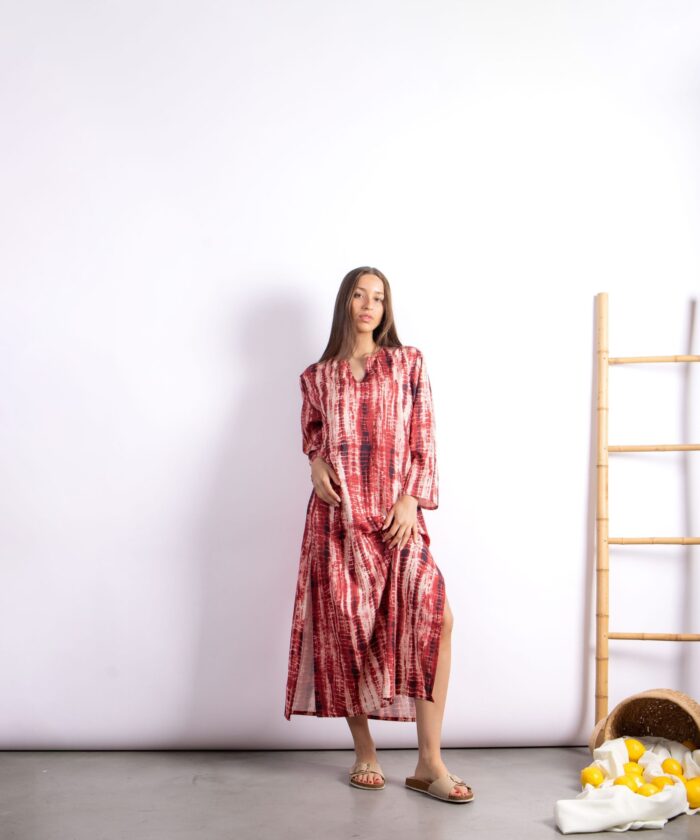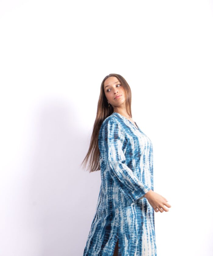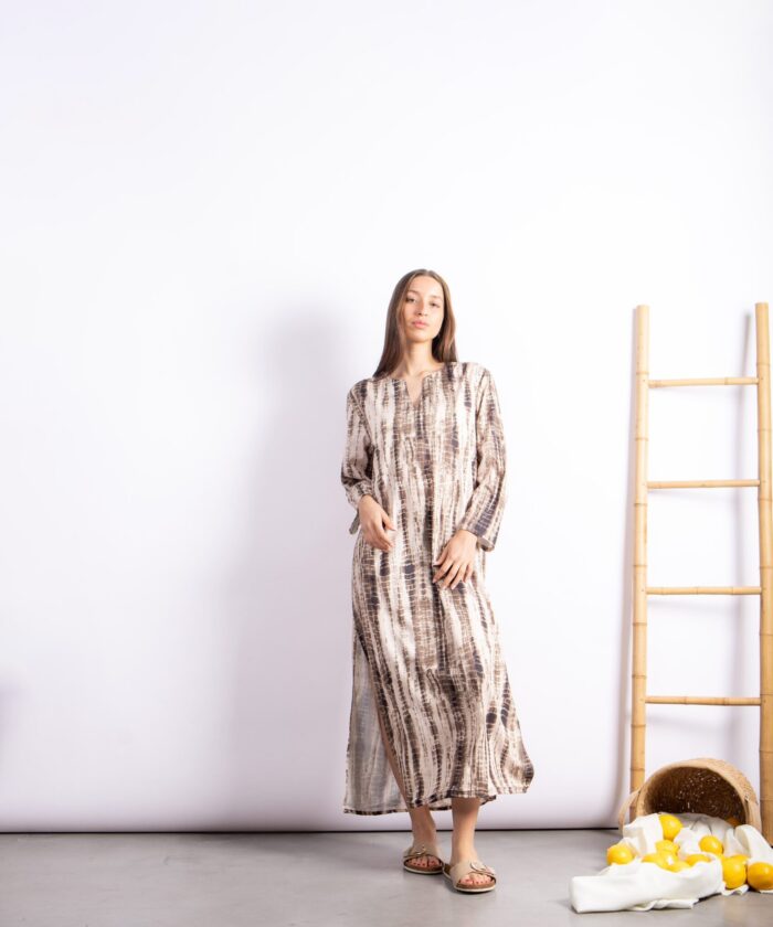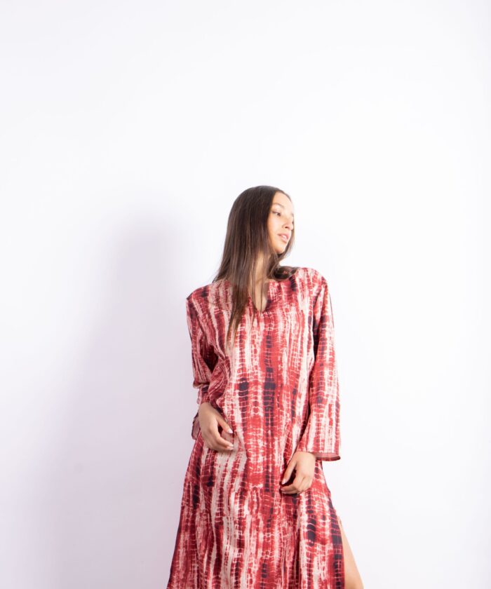 Túnica larga con diseño exclusivo tipo símil batik. Confeccionada en Seda For Way de textura suave y fluida que acompaña el movimiento. Presenta escote en V, mangas largas amplias y tajos laterales que aportan comodidad y estilo.