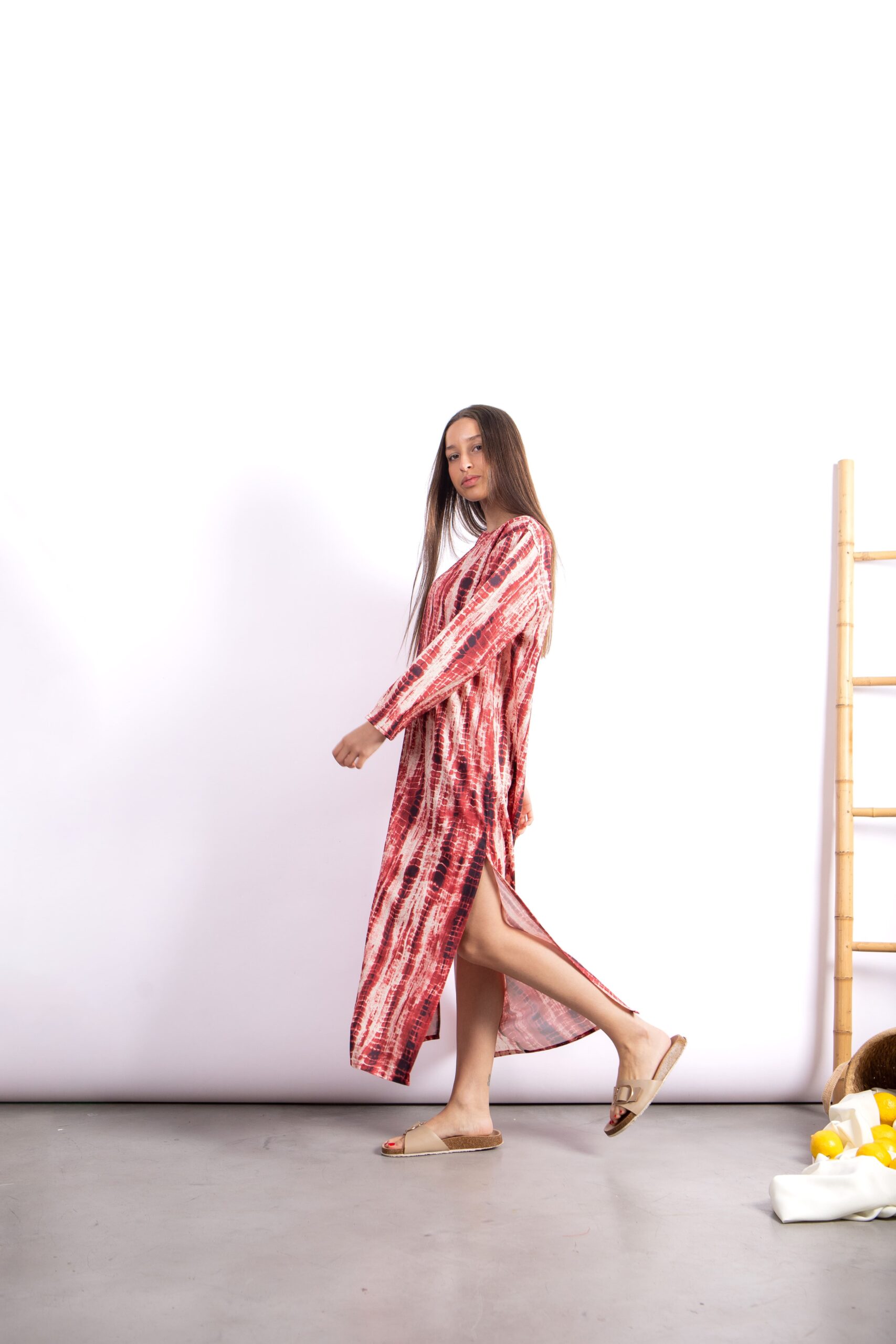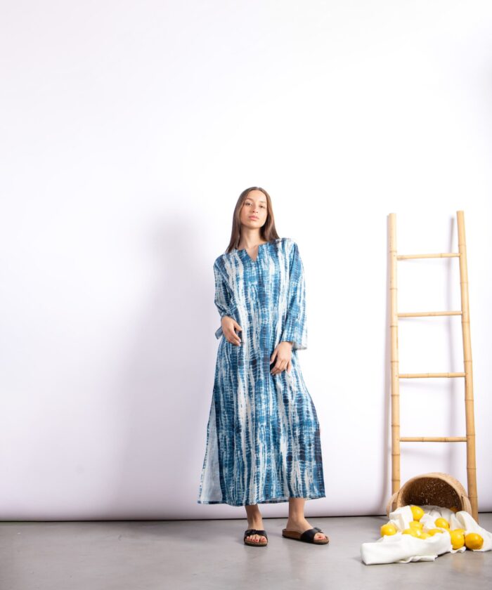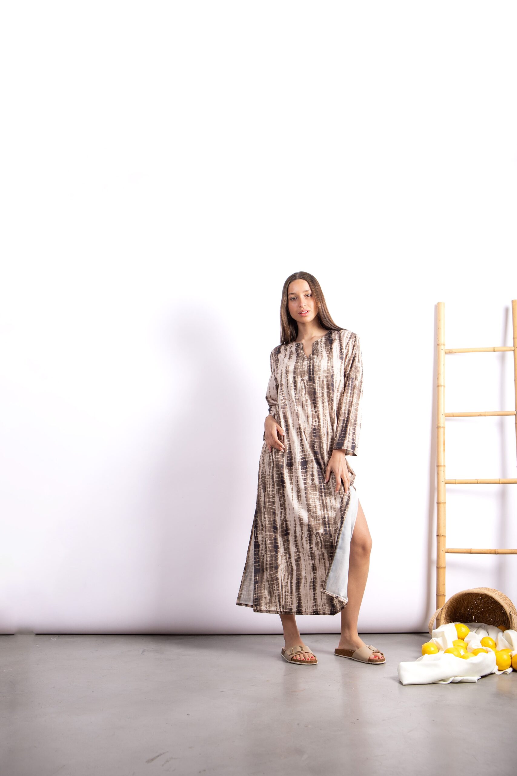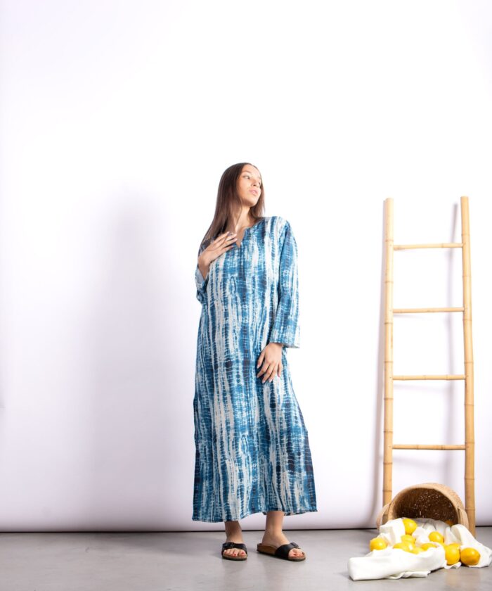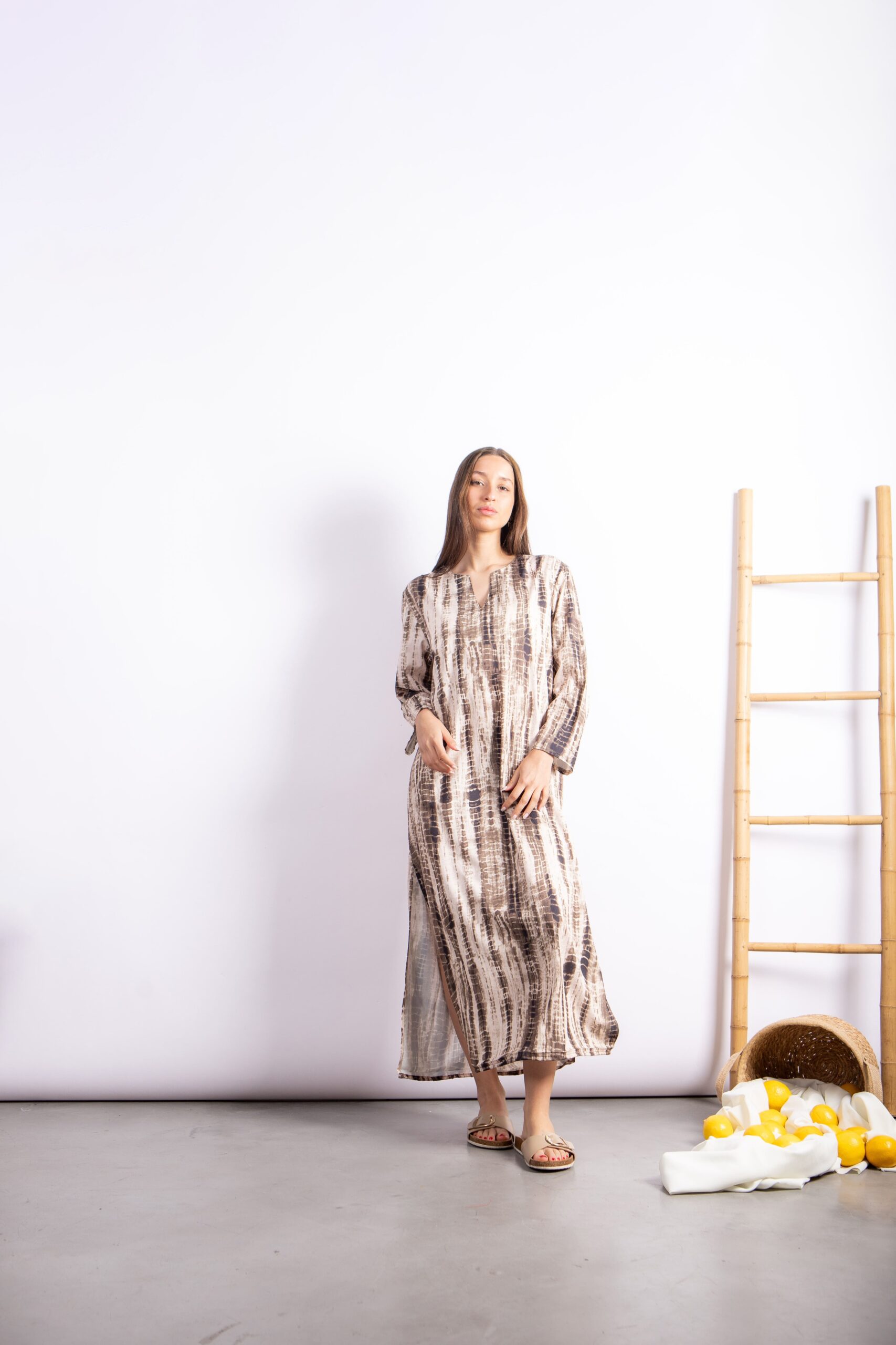 Túnica larga con diseño exclusivo tipo símil batik. Confeccionada en Seda For Way de textura suave y fluida que acompaña el movimiento. Presenta escote en V, mangas largas amplias y tajos laterales que aportan comodidad y estilo.